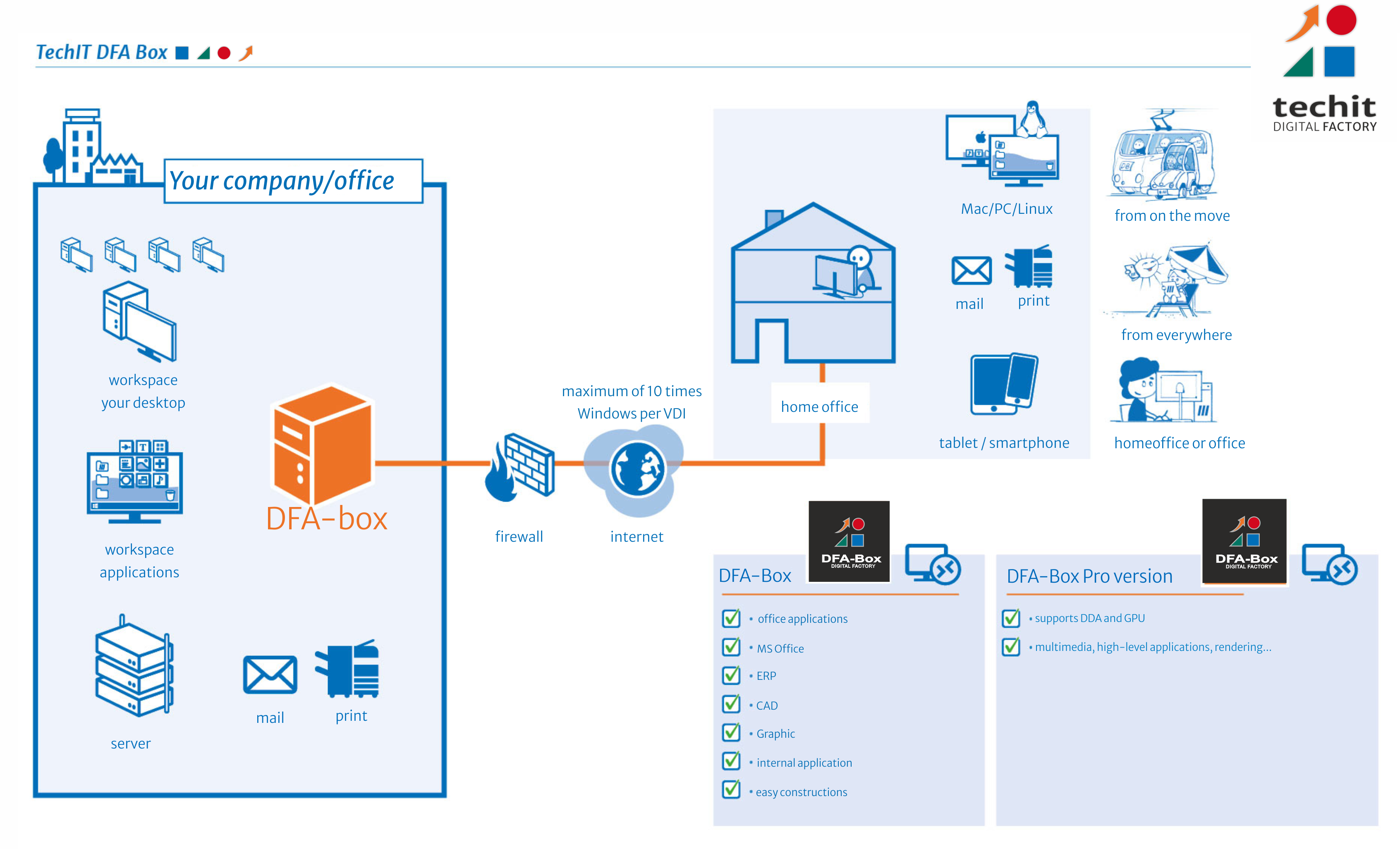 Die DFA-Box ist für alle Unternehmen, die nicht in der Cloud arbeiten, die wohl einfachste, schnellste und sicherste Möglichkeit ohne entsprechenden Aufwand und Umstrukturierung des Netzes jedem Mitarbeiter seinen persönlichen Desktop zur Verfügung zu stellen.